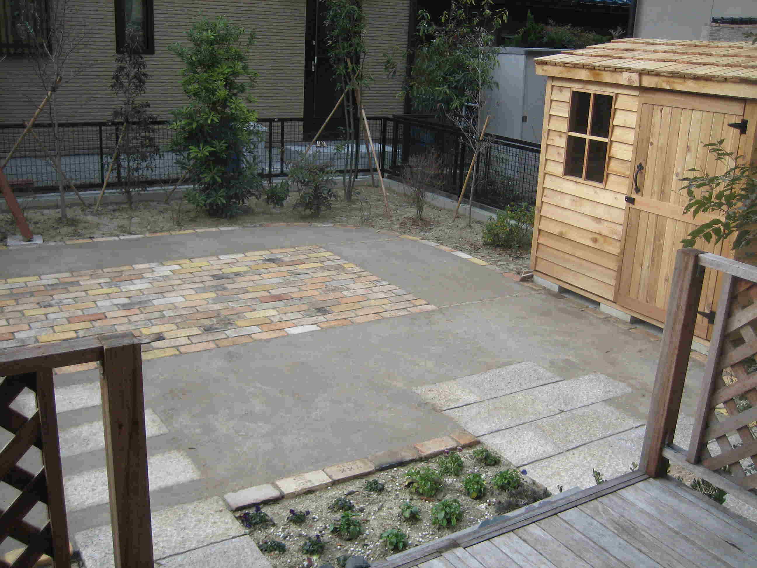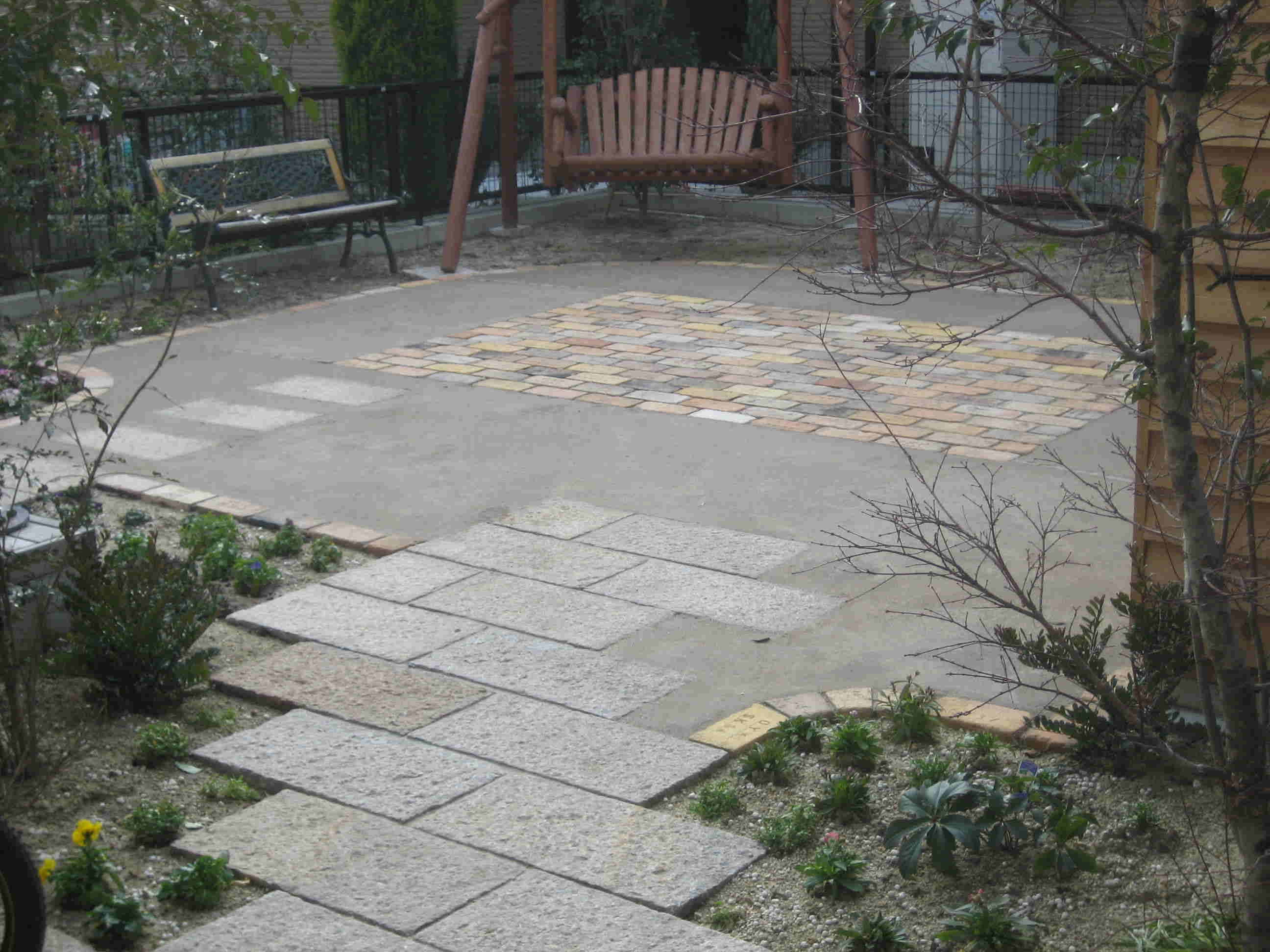 庭の中ほどの大きな部分をアンティーク煉瓦と、かたまる土で舗装しました。